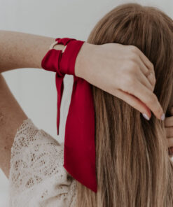 The ribbon is made from silk imitation fabric with a satin finish. The silk ribbon can also be worn as an accessory in the hair, on a handbag, etc.
